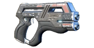 A heavy semi-automatic pistol, the powerful Carnifex was the preferred choice of Milky Way mercenaries. An expensive weapon, its marketing materials featured a charging krogan alongside the tagline "Don't you wish Carnifex was at your side?"