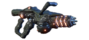 The massive kett Soned, translated as "resistance", rapidly unleashes plasma-surrounded projectiles after a brief changing period. Much of the Soned's size is devoted to insulating the user from its own power. A damaged Soned could incinerate its wielder's hands while continuing to fire.